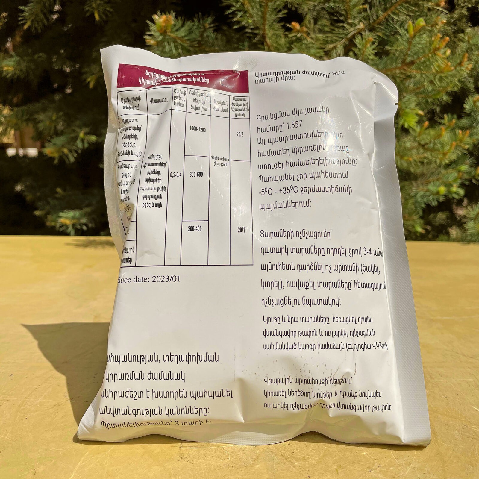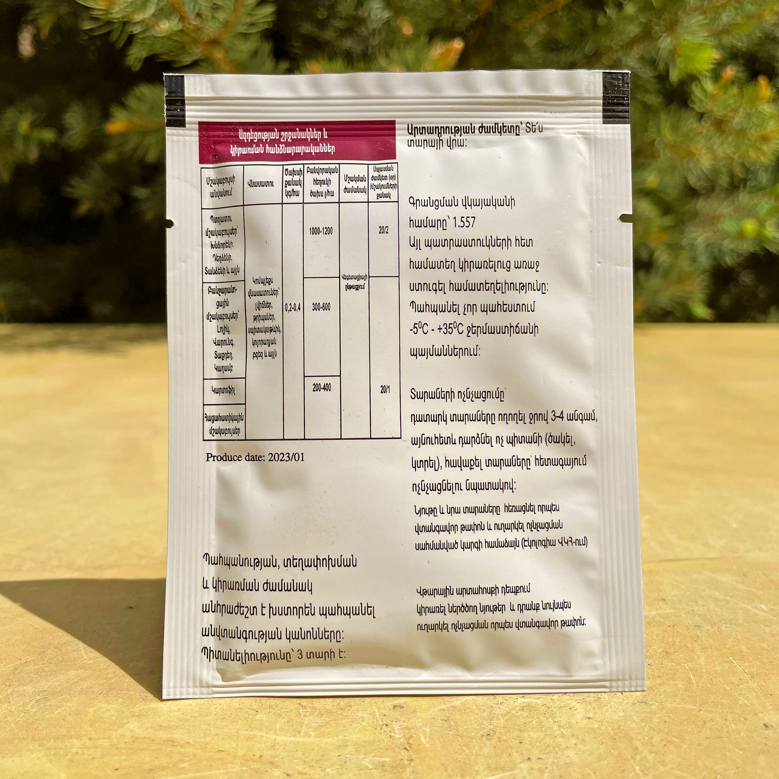 - Հացահատիկային մշակաբույսեր | Վնասատու` Կոմպլեքս վնասատուներ՝ լվիճներ, թրիպսներ, սպիտակաթևիկ, կոլորադյան բզեզ և այլն | Ծախսի քանակ կգ/հա` 0,2-0,4 | Բանվորական հեղուկի ծախս լ/հա` 200-400 | Մշակման ժամանակ` Վեգետացիայի ընթացքում | Սպասման ժամկետ (օր) /մշակումների քանակ` 20/1