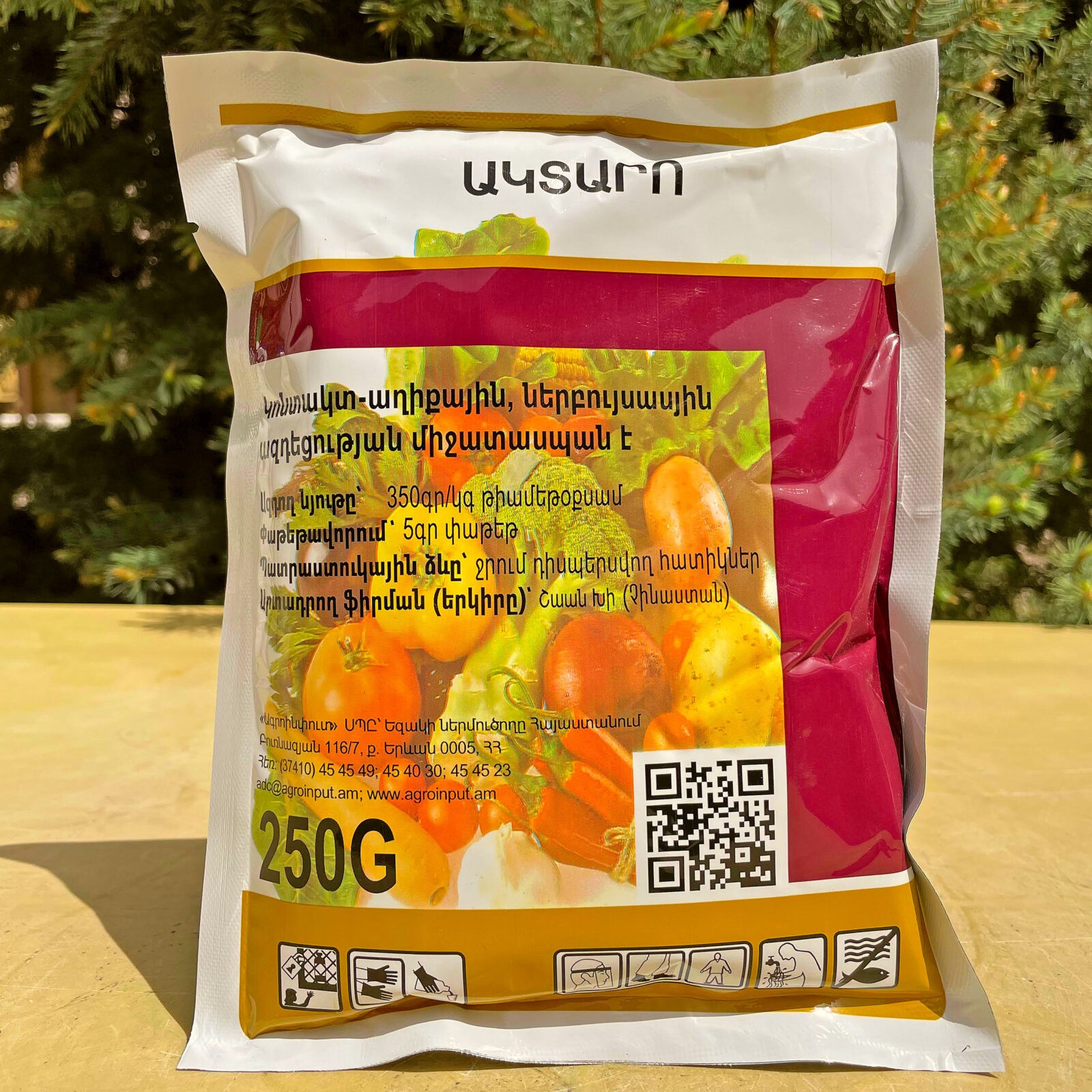 - Կարտոֆիլ | Վնասատու` Կոմպլեքս վնասատուներ՝ լվիճներ, թրիպսներ, սպիտակաթևիկ, կոլորադյան բզեզ և այլն | Ծախսի քանակ կգ/հա` 0,2-0,4 | Բանվորական հեղուկի ծախս լ/հա` 200-400 | Մշակման ժամանակ` Վեգետացիայի ընթացքում | Սպասման ժամկետ (օր) /մշակումների քանակ` 20/1